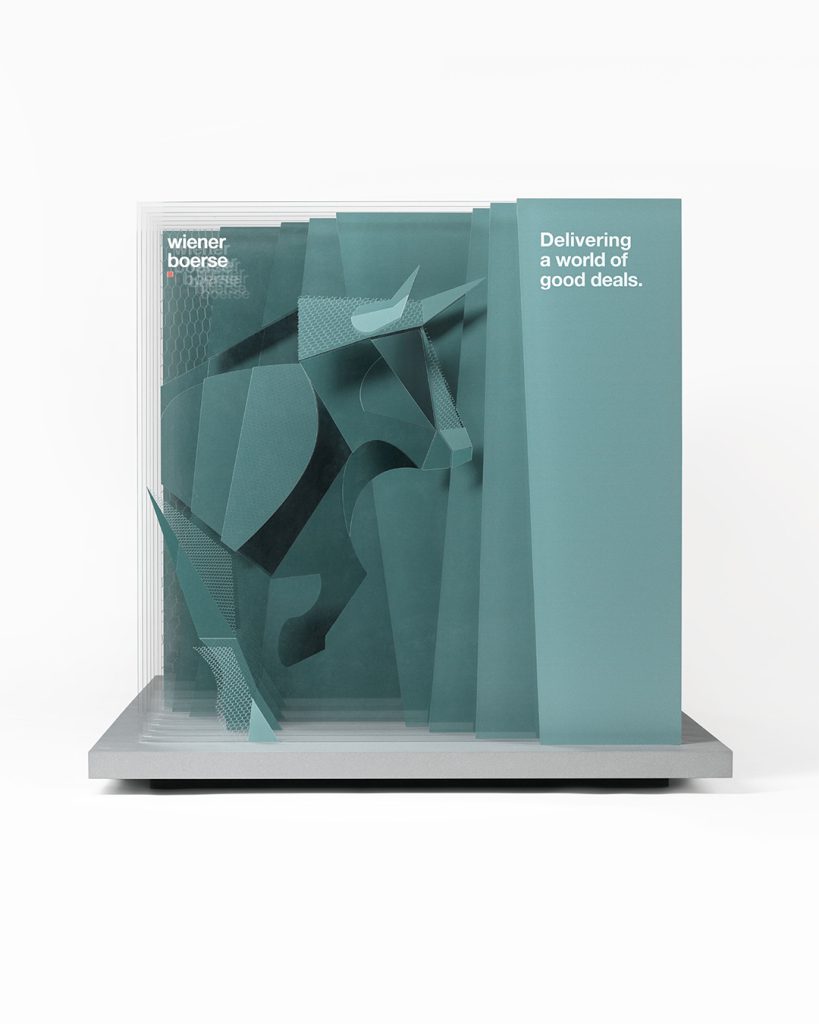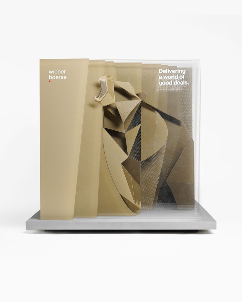 Darum stehen sich in unserem neuen Branding für die Wiener Börse der Bär und der Bulle ebenbürtig gegenüber. Ein moderner Gedanke, der sich auch im Key Visual wiederfindet. Schattierungen in der neuen, frischen und modernen Farbwelt mit Petrol und Goldbraun unterstreichen die intersektionalen Aspekte der Symbolik. Passend zum Key Visual haben wir gemeinsam mit 3D-Artist Nick Grambacher eine Skulptur entwickelt, die im Foyer der Wiener Börse ausgestellt wird. Der Bär und der Bulle. Der Börse ewige Begleiter. Bei uns fast schon Hand in Hand, sozusagen.